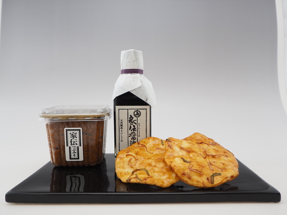 秋田県産米を100%使用したお米の生地を焼き、安藤醸造の味噌醤油をブレンドした特製ダレに、生ねぎをくわえて味付けをした本格ねぎ味噌煎餅です。