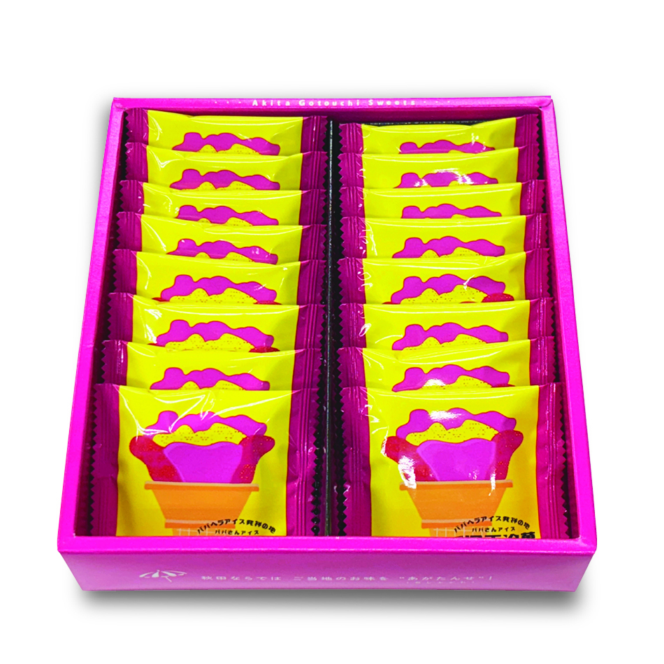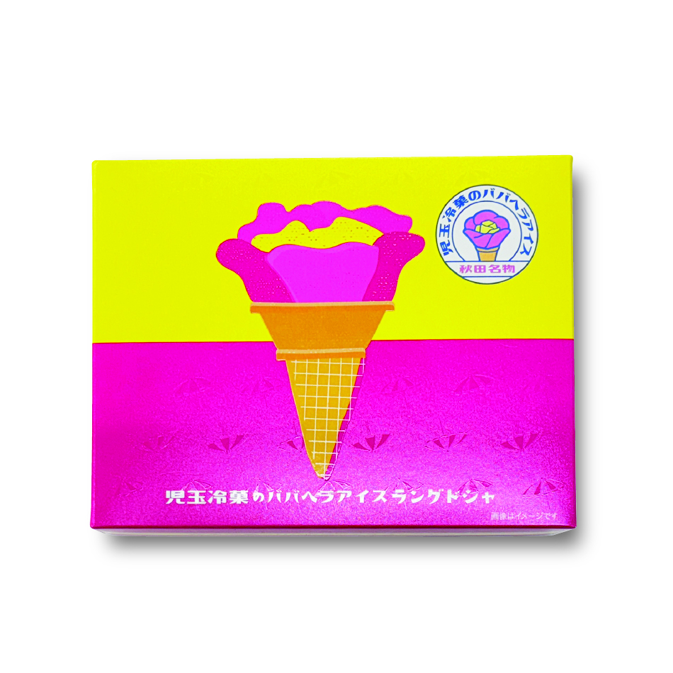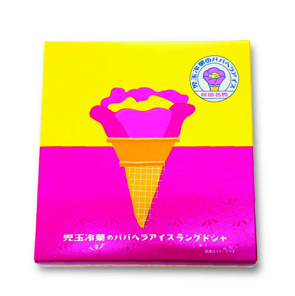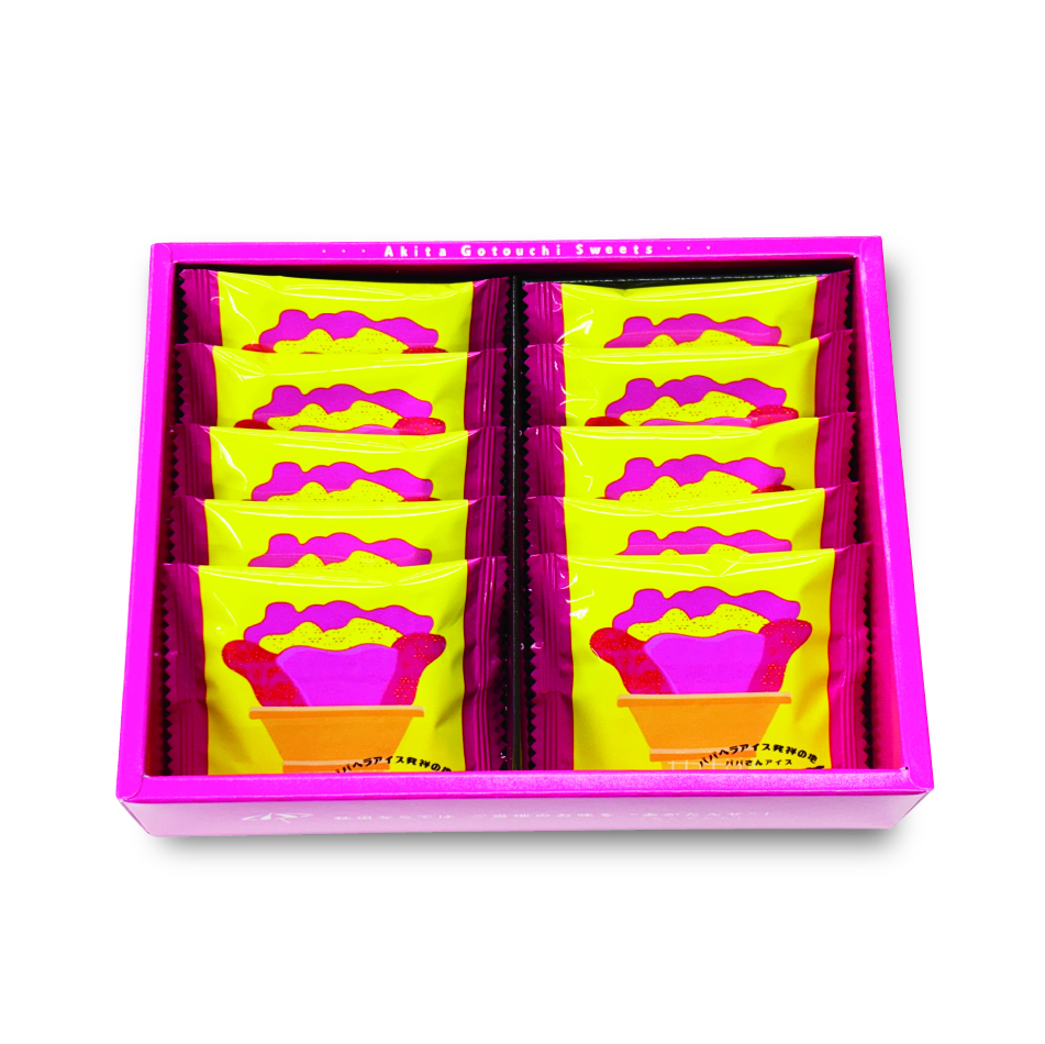 バラ盛りと呼ばれるバラの花のような盛り付けが目を引くこのスイーツは、ピンク(イチゴ味)、黄色(バナナ味)の素朴でどこか懐かしい秋田名物です。この「児玉冷菓のババヘラアイス」をイメージし、気軽に持ち帰られるお菓子として開発しました。