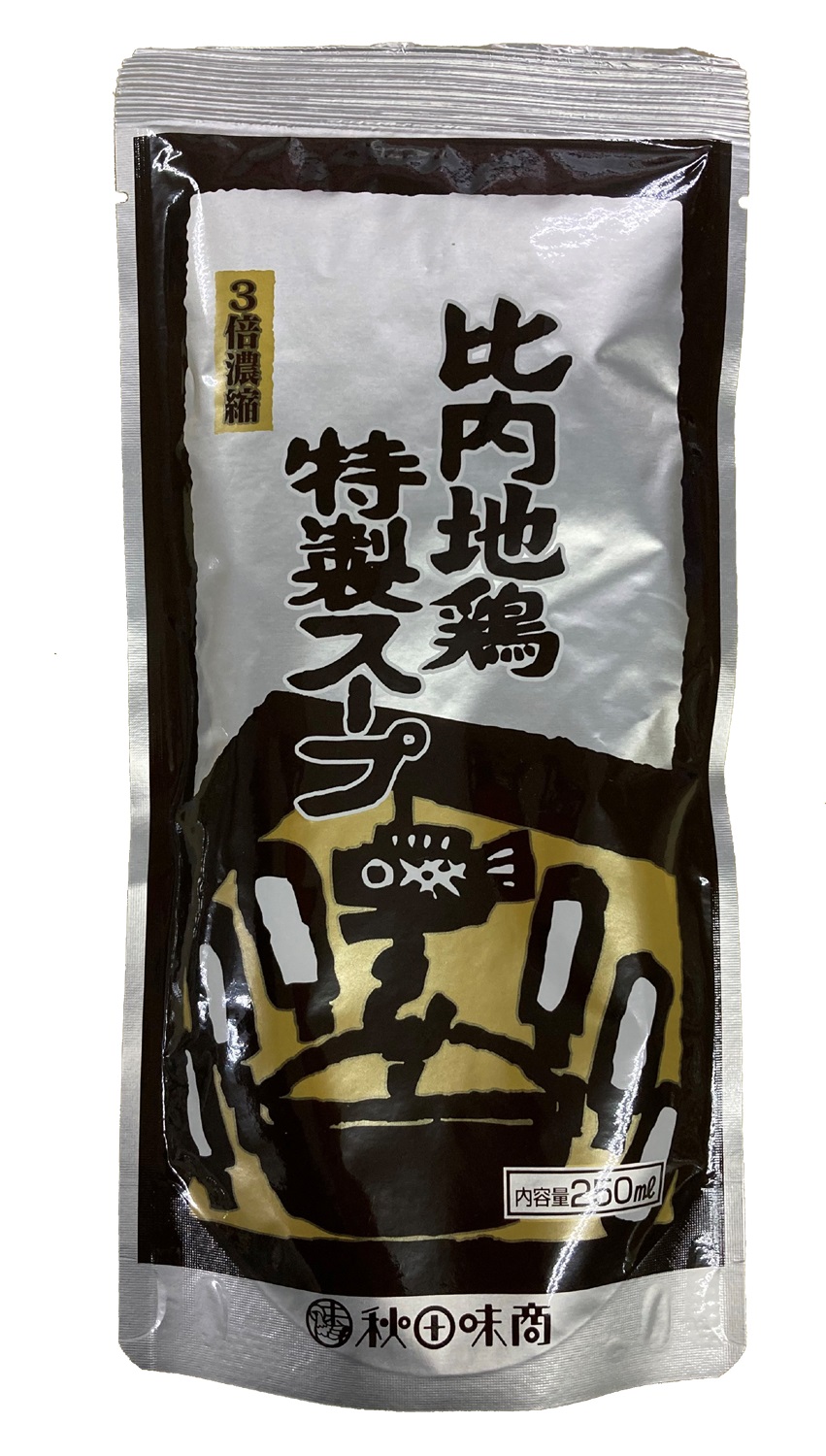 比内地鶏ガラスープ(エキス)をベースとした醤油味の3倍濃縮スープです。きりたんぽ鍋を始め、各種鍋料理・うどんのつゆ等にお使いいただけます。原材料等を見直し、化学調味料無添加になりました。