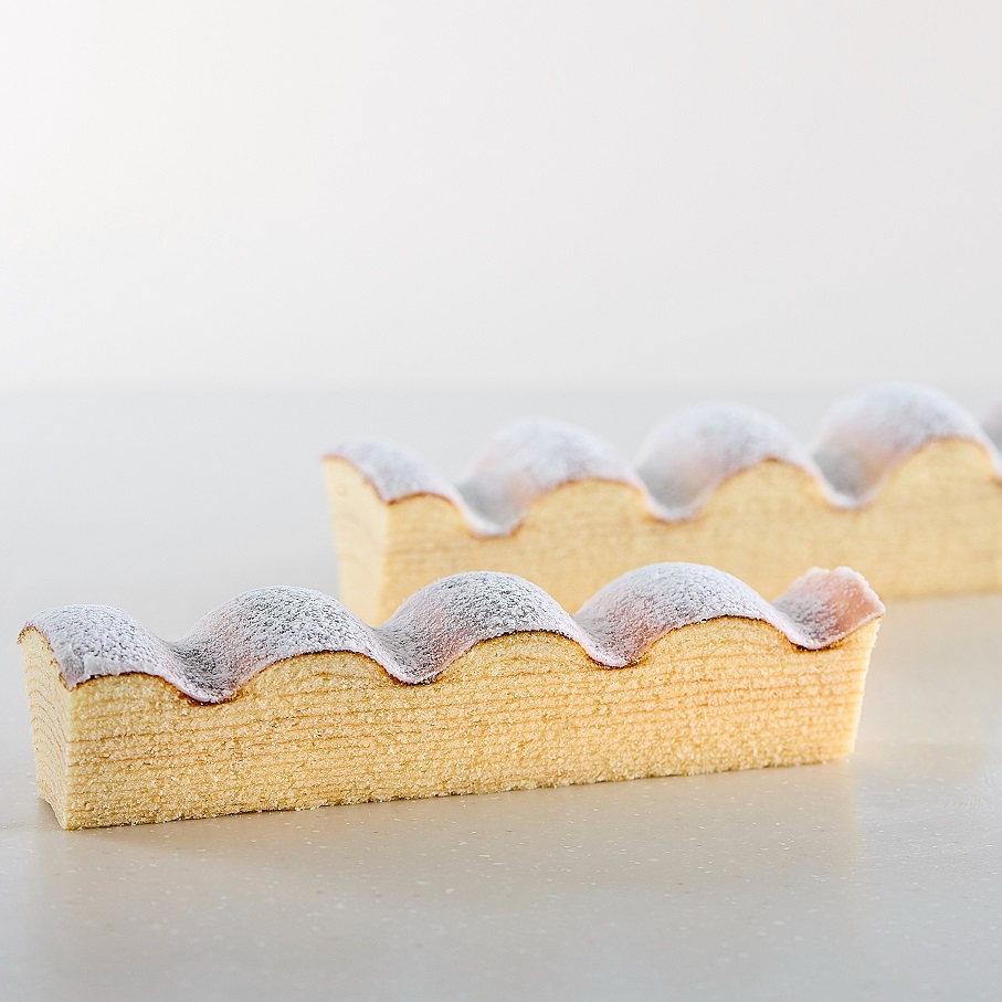 北海道の自社牧場で搾った放牧牛乳や平飼い卵を使いふんわり厚みのある層に焼き上げました。