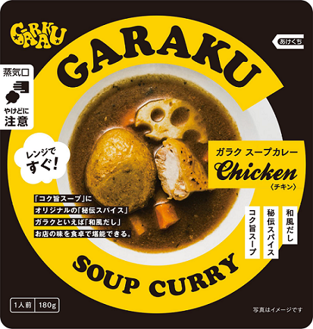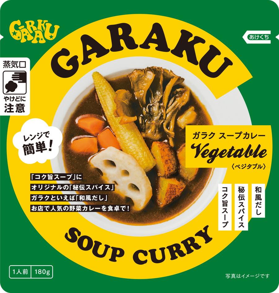 北海道のソウルフード”スープカレー“から定番のチキンスープカレーと、お客様からのご要望が多かった5種野菜(じゃがいも・レンコン・にんじん・まいたけ・ヤングコーン)が入ったベジタブルスープカレーと、GARAKU秘伝辛味スパイスが入った7空港限定セットです。