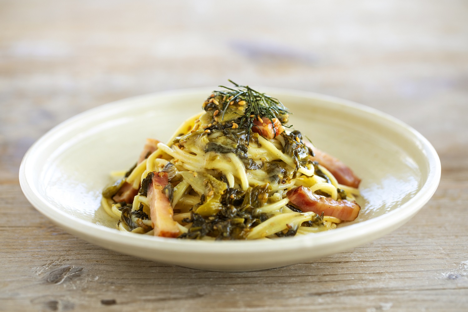 ゴロゴロベーコンと九州高菜の和風スパゲティ