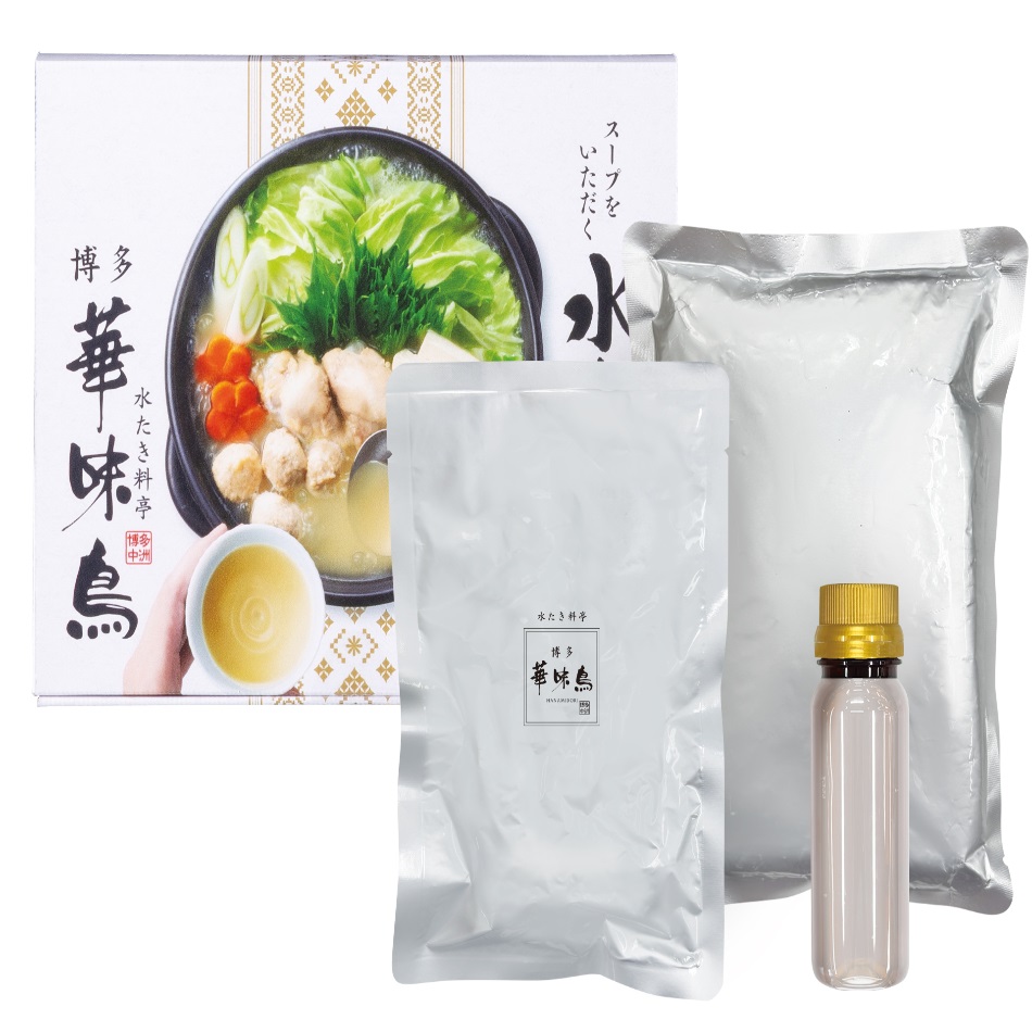 博多・中洲に本店を構え、大阪・東京にも店舗展開する「水たき料亭 博多華味鳥」。店舗でお召しあがりいただくように、最初の一口目のスープから最後の〆(しめ)まで、鶏本来の旨みをよりしっかりと感じられる逸品です。水たき料亭オリジナルのぽん酢と一緒にご賞味ください。