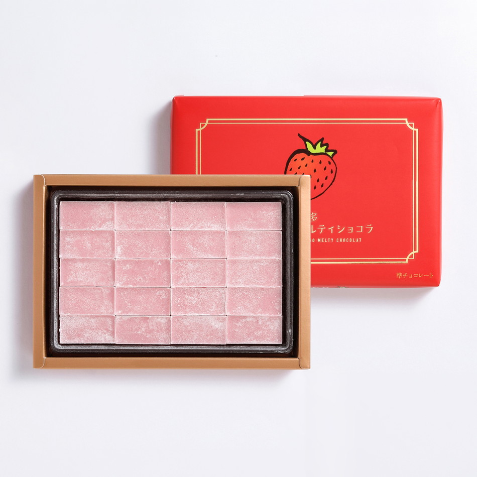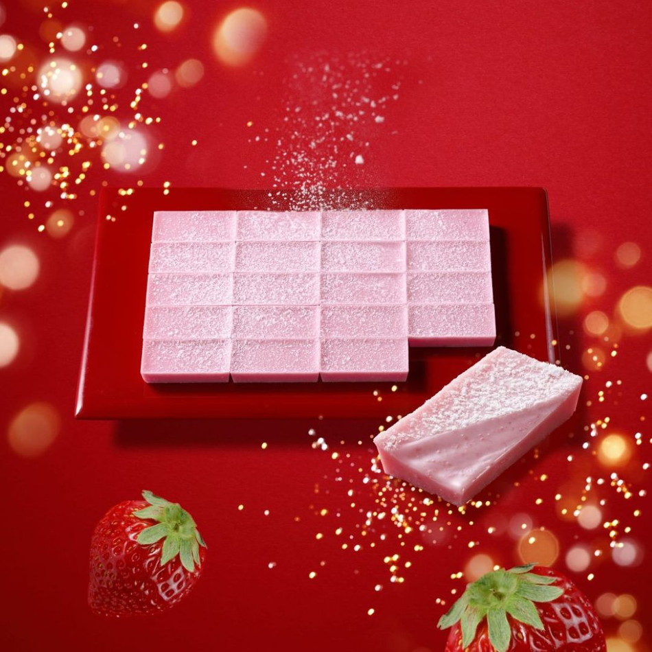 まるで雪化粧のような粉糖を纏った、甘酸っぱい果実感あふれるあまおう苺チョコレートです。 粒感を残したあまおう苺パウダーのシャリシャリ食感がアクセントになっています。