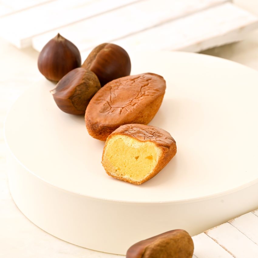 薄くソフトなカステラ生地に刻んだ栗を入れた自家製ハーバー餡をやさしく包み込み、しっとりとした食感と口に広がるマロンの味わいが絶妙な一品です。