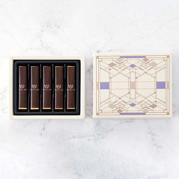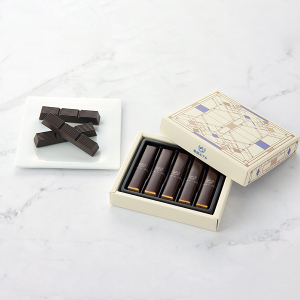 帝国ホテル 東京館内のステンドグラスをモチーフにしたデザインの箱に、帝国ホテル2代目本館(通称「ライト館」)の外壁のスクラッチタイルを模したスティック型のビターチョコレートを詰めました。ブルーをアクセントにしたシックなデザインで、ちょっとしたプレゼントにはもちろんご自身へのご褒美にもおすすめです。