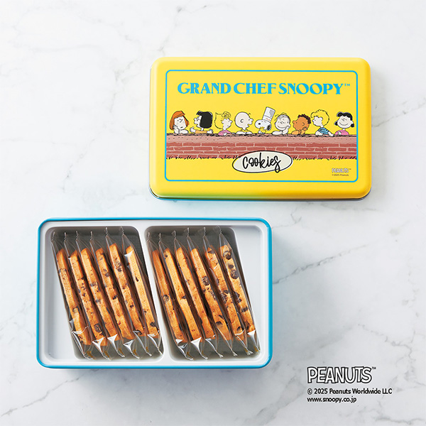 爽やかな黄色と水色のコントラストが目を引く缶に、料理長スヌーピーとピーナッツの仲間たちが勢ぞろいしたデザインです。デザイン缶の中にはスヌーピーの好物のチョコチップクッキーを詰めています。スヌーピー好きの方へのギフトにはもちろん、ご自身へのご褒美やコレクションにもおすすめです。