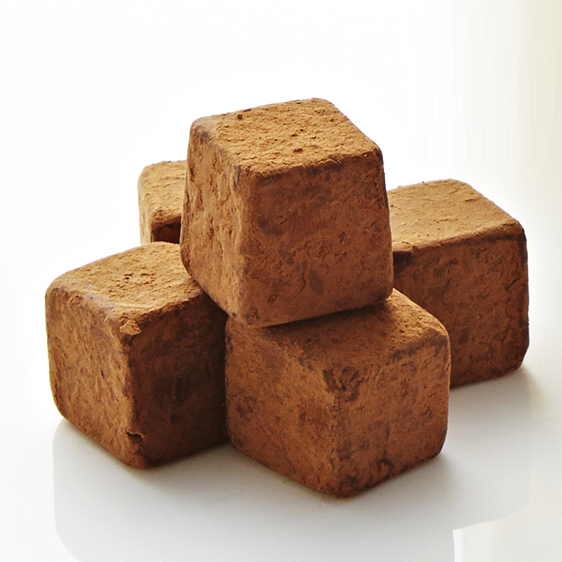 なめらかな口どけのガナッシュをココアパウダーでコーティングした、大人風味のキューブ型チョコレートです。