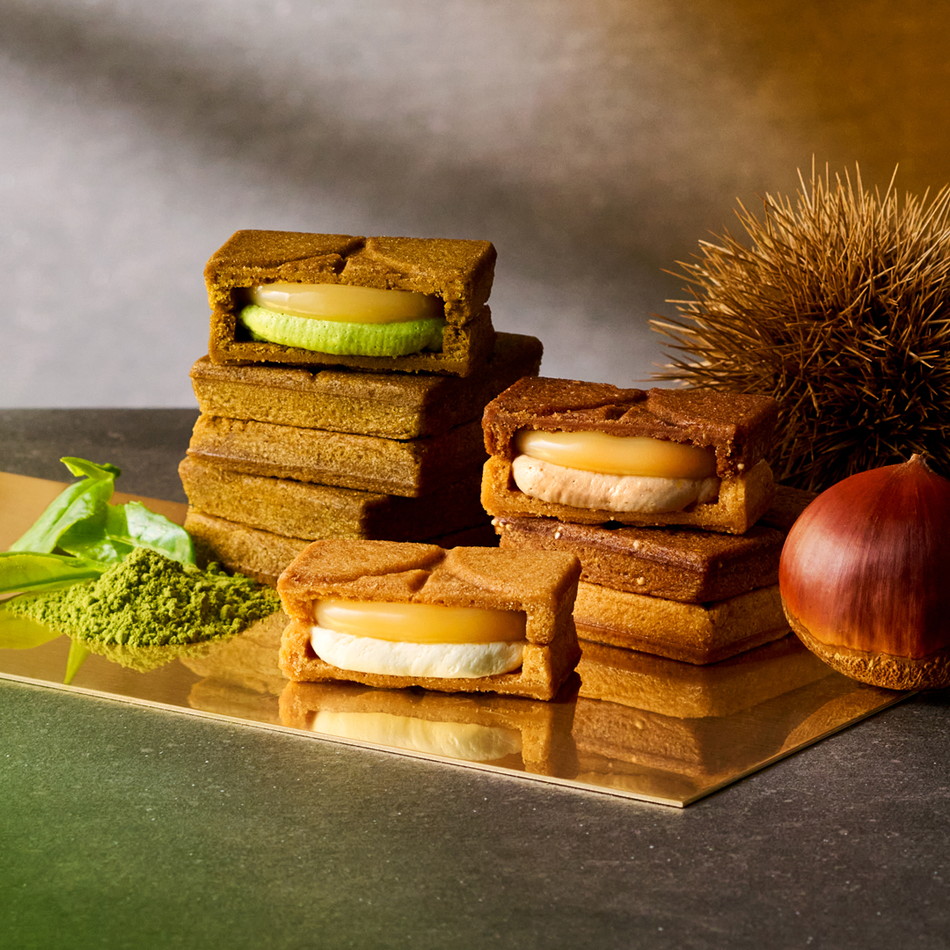 〈栗〉はイタリア産の栗から作ったマロングラッセを練り込んだ栗バタークリームとバターキャラメルを合わせ、栗そのものを食べているかのような濃厚な味わいに仕上げ、〈宇治抹茶〉はすっきりとした苦みと、香りの良い宇治抹茶を使った抹茶バタークリームと上品な甘さのバターキャラメルをクッキーで挟みました。風味豊かな3種の美味しさをご堪能ください。