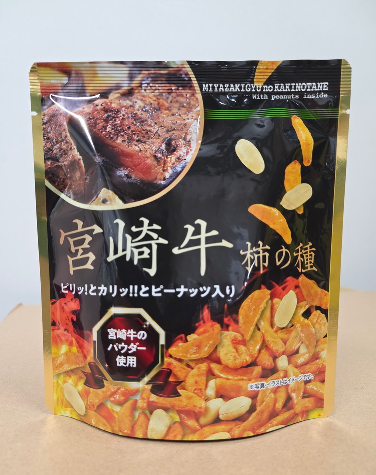 ビールやお酒等のお供に、おやつにおすすめの商品です!宮崎牛パウダーを使用したピーナッツ入り柿の種です。