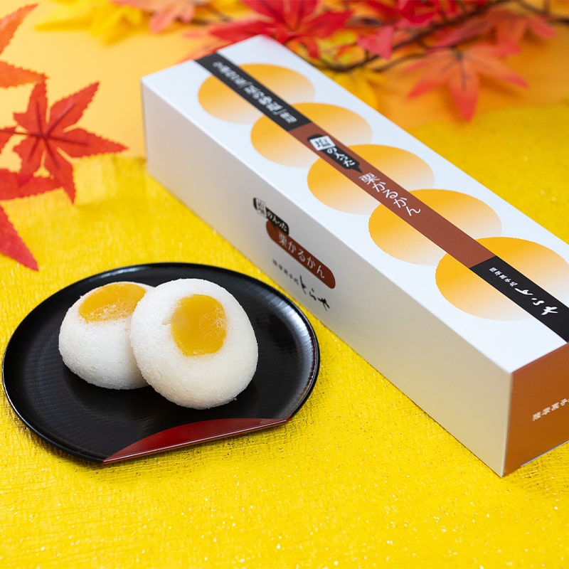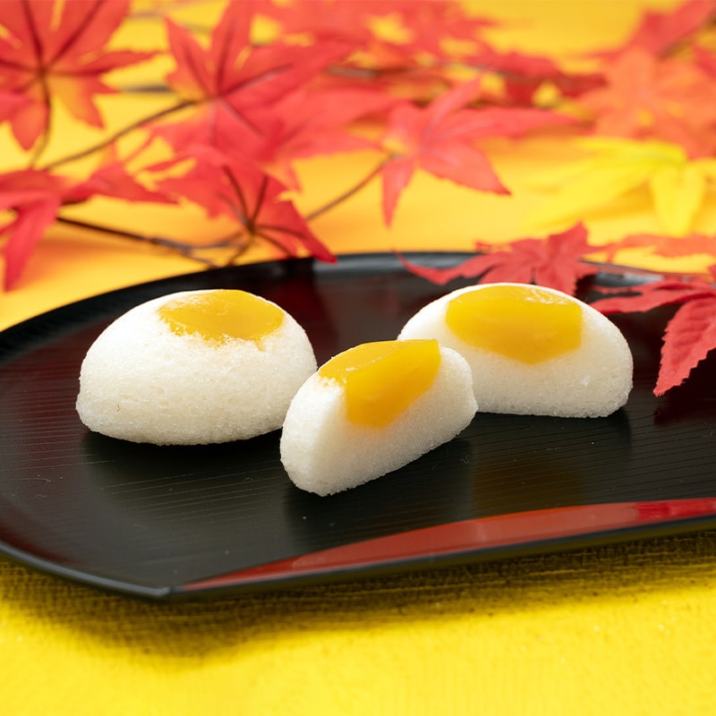 鹿児島県与論島産「星の砂塩」と、霧島の天然名水「関平鉱泉水」を生地に使用。かるかんの生地にほんのりと塩気があり、中央にある大粒の栗の甘さを引き立てています。秋限定。今しか召し上がる事の出来ないかるかんです。