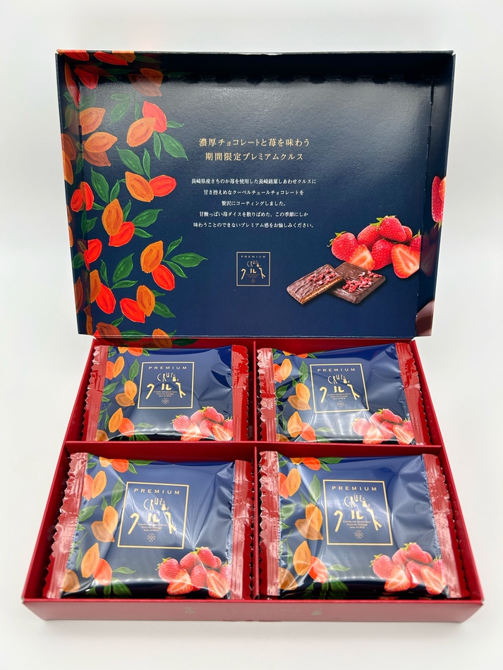 長崎銘菓クルスを、ビターチョコでぜい沢にコーティングし、苺のフリーズドライを上品にあしらった季節限定商品。 パリッと軽やかな食感と、ほろ苦さと甘酸っぱさが織りなす華やかな味わいをお楽しみください。