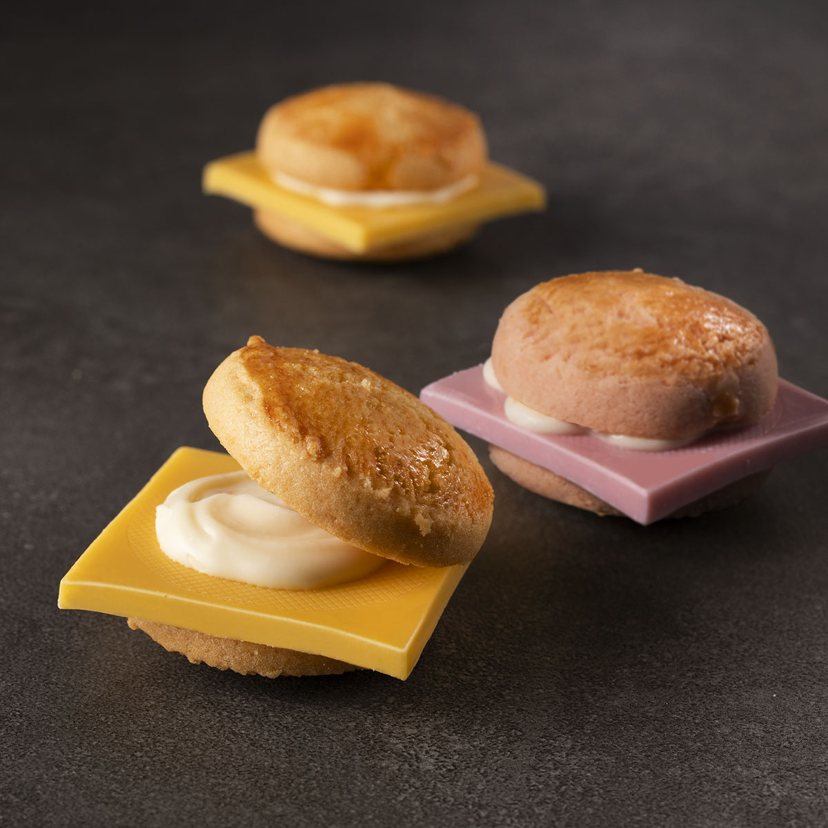 チェダーチーズショコラがとろけるチーズ味「チーズチョコレートバーガー」、甘酸っぱい苺を練りこんだストロベリーショコラの上にホイップショコラをぷっくりしぼった「ストロベリーバーガー」が入ったセットです。