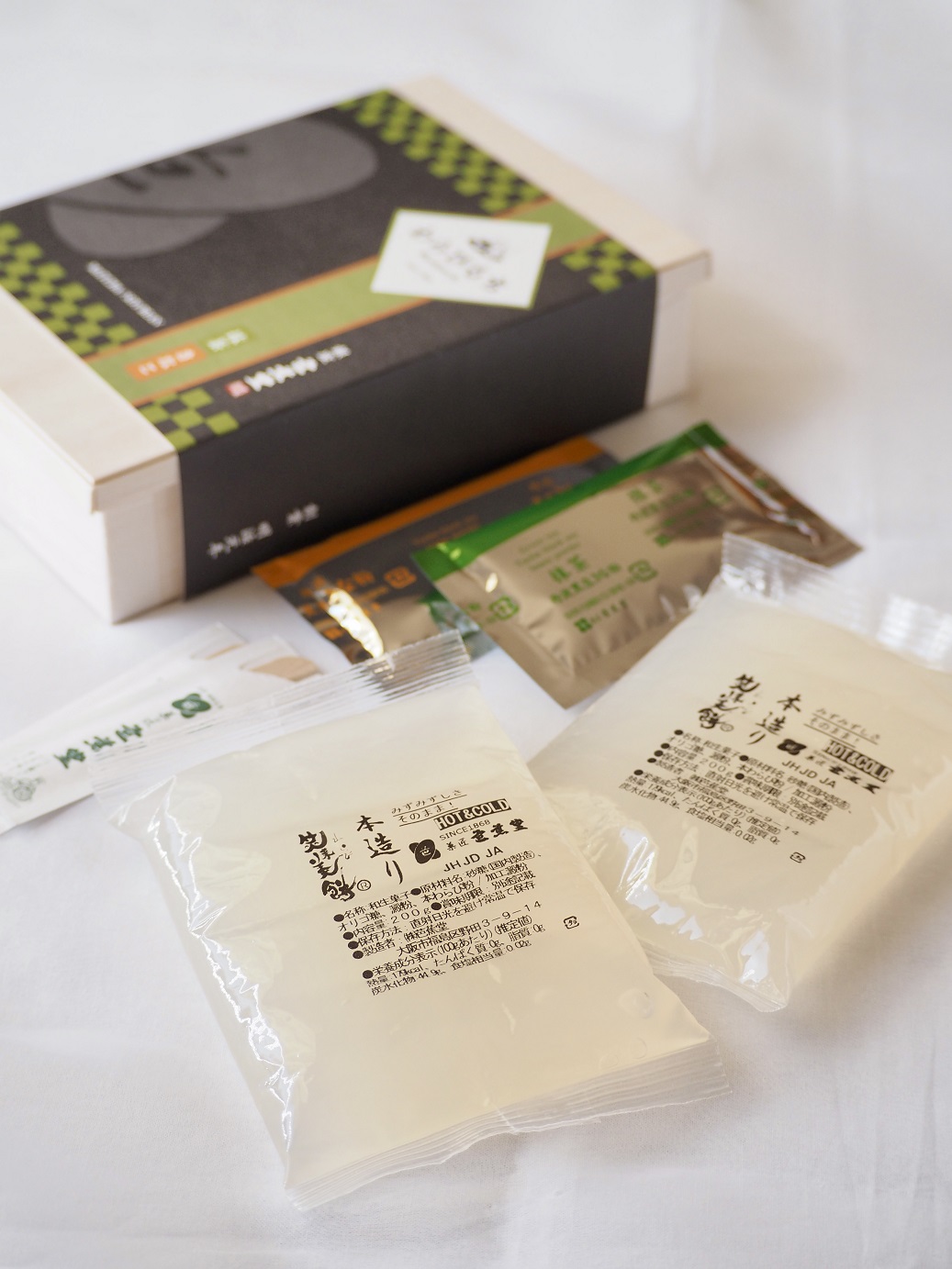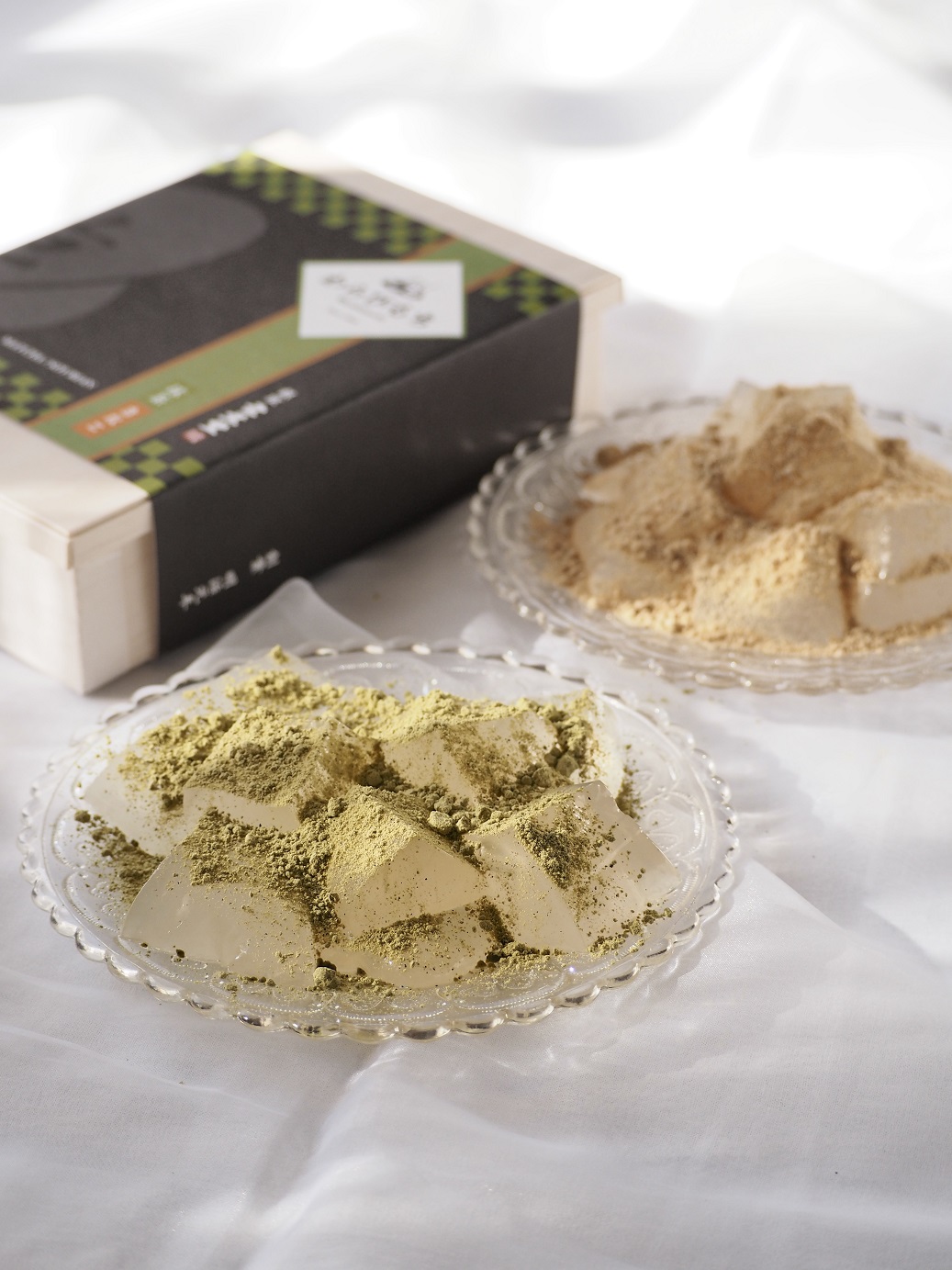 芭蕉堂の看板商品「笑来美餅(わらびもち)」のきな粉と抹茶、二つの味を木箱に詰めました。贈答用にもおすすめです。