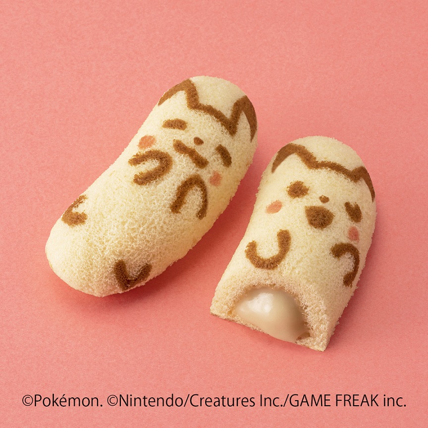 ふわふわしっとりの生地に、ナナのみ味を表現した、とろーりバナナカスタードクリーム。ピカチュウのほっぺもおちちゃいそうなほどのおいしさです。スポンジケーキのピカチュウ模様はランダムで6種類。ピカチュウと一緒に、わくわくおやつタイムをお楽しみください!