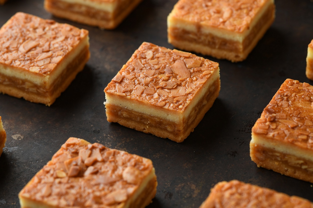 香ばしくローストしたアーモンドに自家製生キャラメルを絡め、特製のクッキー生地でサンドし、じっくり焼き上げました。