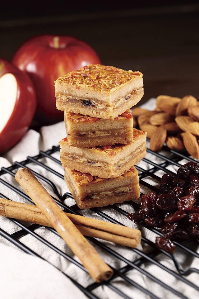 自家製生キャラメルにローストしたアーモンドとリンゴ、レーズンを絡めシナモンクッキーでサンドして焼き上げました。