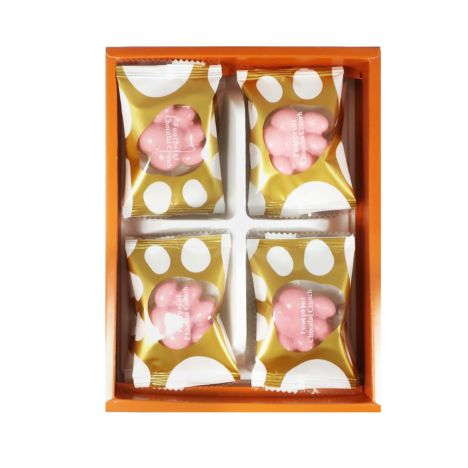 立体的なねこの肉球型が可愛らしいチョコレートクランチです。 いちご風味のチョコとホワイトチョコクランチの2層仕立てとなっており二つの食感が楽しめます。