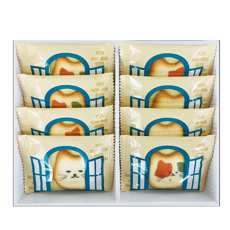 ネコ型のラングドシャで、板状のホワイトチョコレートをサンドしました。 プリントされたネコのお顔のデザインは全部で3種類。 ランダムに入っていますので、どれが出てくるか楽しみながらお召し上がりください。