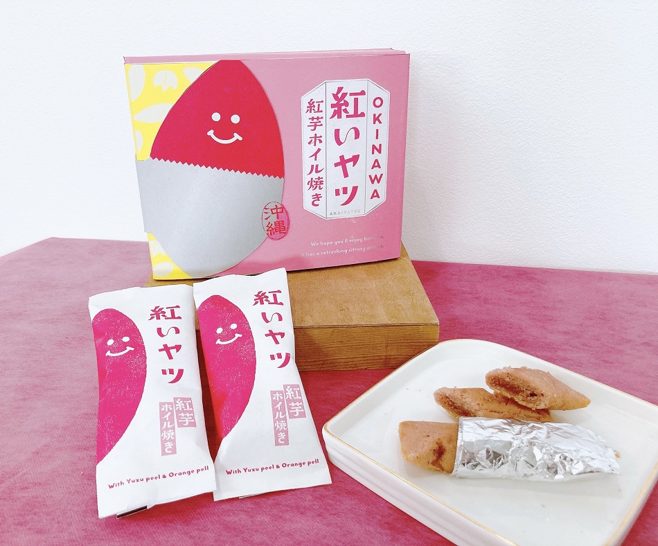 「大事なヤツに届けるオヤツ」。久米島産の紅芋を生地にも餡にもたっぷりと使い、華やかなピンク色に仕上げたホイル包み焼きケーキです。ホイルで包みしっとりと焼き上げることで、紅芋本来の風味が際立ちます。柚子皮の爽やかな香りと紅芋のやさしい甘さが調和した、懐かしいようで新しい紅芋スイーツ。大切な人への贈り物にも、自分へのご褒美にもぴったりです。