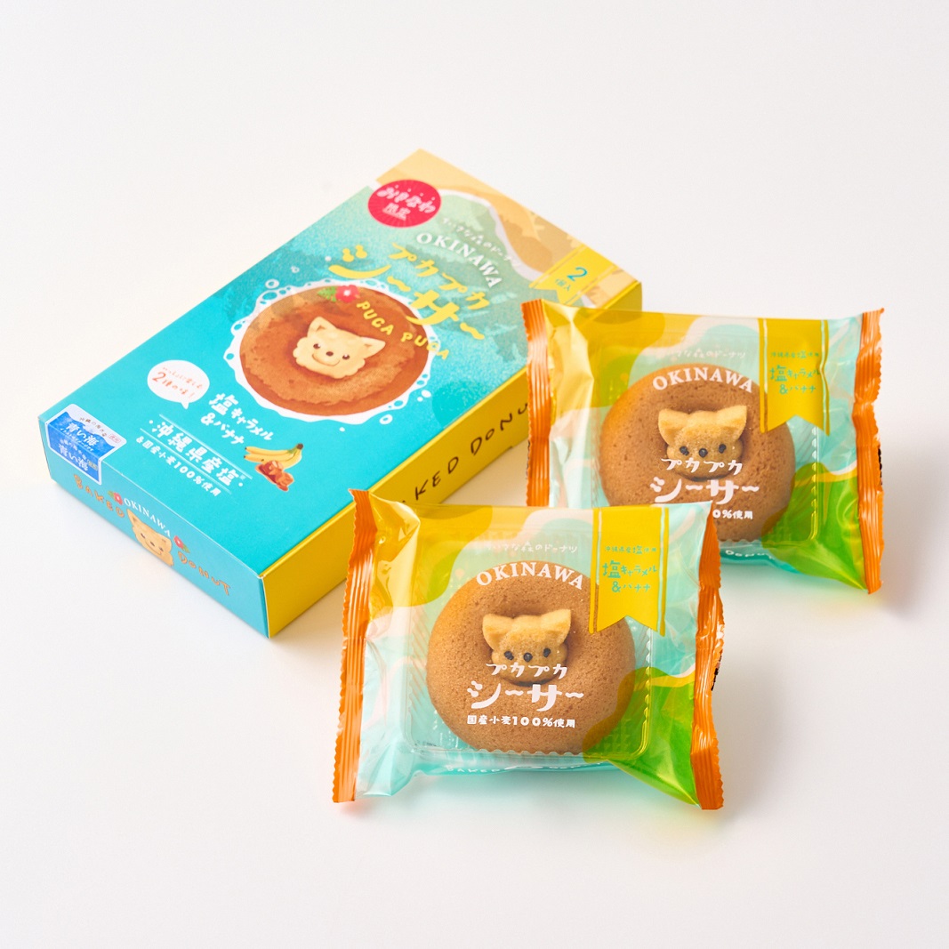 沖縄県産の塩「青い海」とキャラメルのベストマッチな組み合わせのドーナツと、真ん中にはドーナツ生地のバナナ味のシーサー。一緒に食べると新しい美味しさが広がります。浮き輪で沖縄の海にプカプカと浮かんでいるような可愛いドーナツです。沖縄限定販売の商品です。