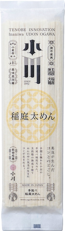 よりおいしいうどんをお届けするため、より良い素材を使用する。その強いこだわりから、厳選された原材料のみ使用しています。4日間をかけた伝統製法を守り通し、五段階の熟成を経て生まれた小川の稲庭うどん。手作りの証明として、麺の切断面に無数の気泡があいており、ゆで上がりが早く、冷麺・温麺・煮込み等、滑らかな食感をご堪能いただけます。