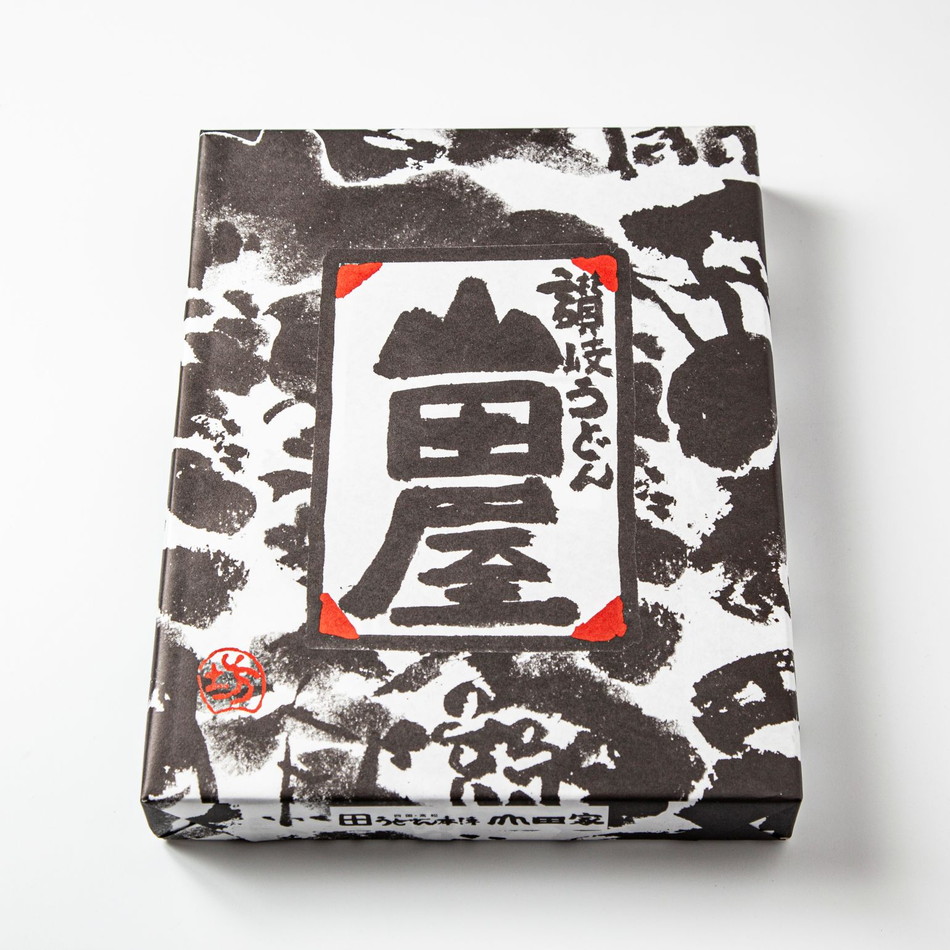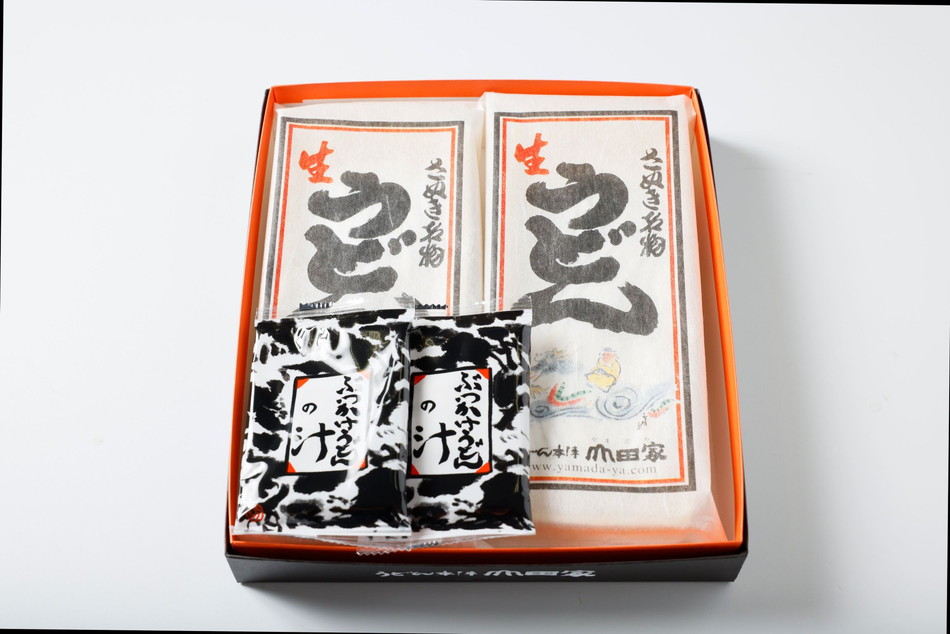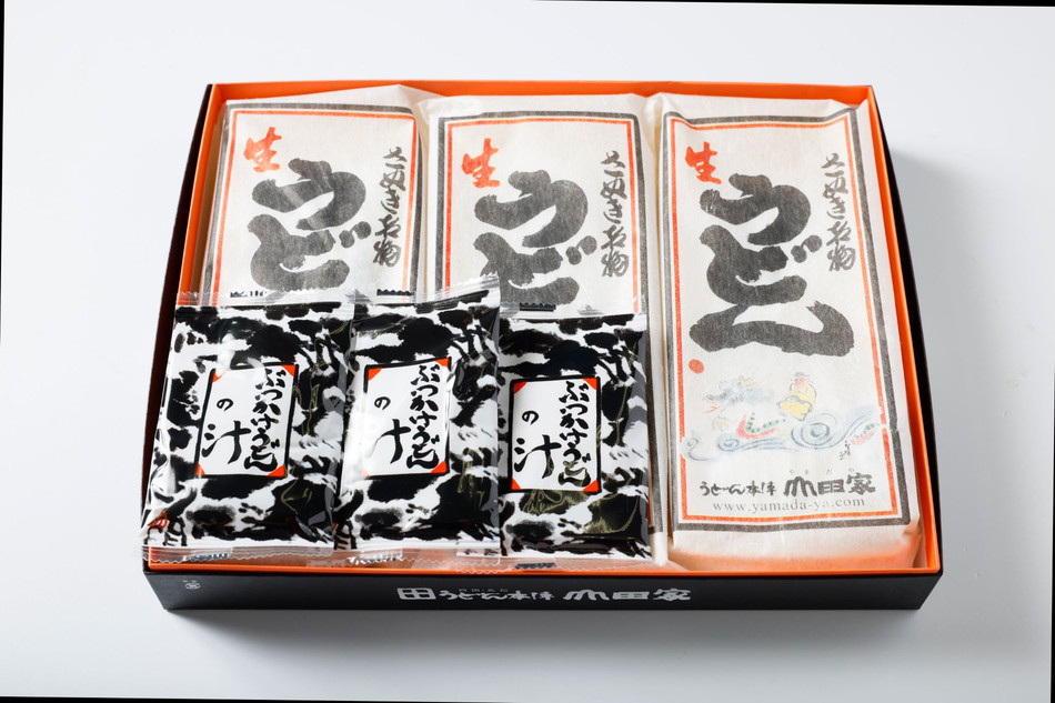うどんは製粉メーカーと共同開発した山田家専用の小麦粉と酒処ならではの良質の水を使用して製造しています。乾燥うどんや半生うどんでは味わえないもっちり感と小麦の香りが特徴です。ティーバッグ型(振出タイプ)のかけうどん用の出汁をセットにしました。完全包装されており、贈答用に最適です。