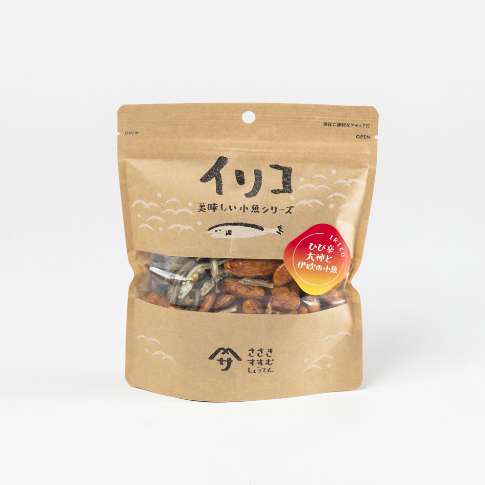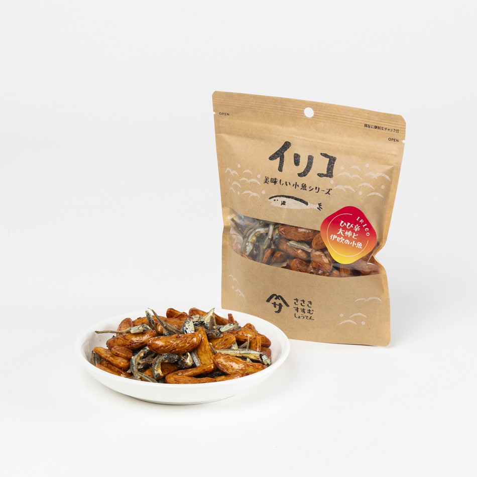 使用している小魚は全て『伊吹いりこ』を使用しています。漁獲から30分以内に加工しているので、内臓まで美味しく食べられます。ひび辛大柿は、少し辛めの物を使用しています。大人向けであり、おつまみとして最高の商品です。