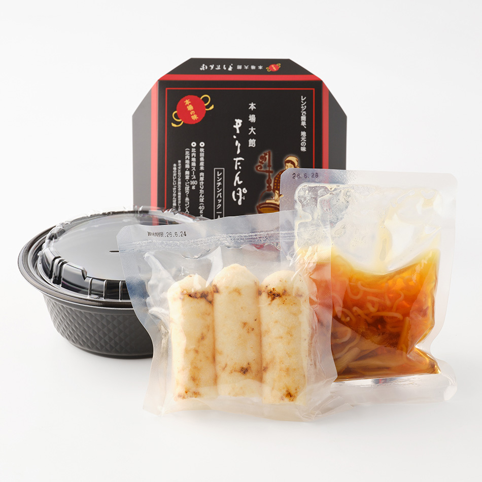 秋田県大館市産の食材を主に使用した人気の「本場大館きりたんぽ・玉手箱」の姉妹品として、味わいそのままに購入しやすい価格に抑えた「スープセット」と、電子レンジで温めて食べられる「レンチンパック」の2種類を販売いたします。