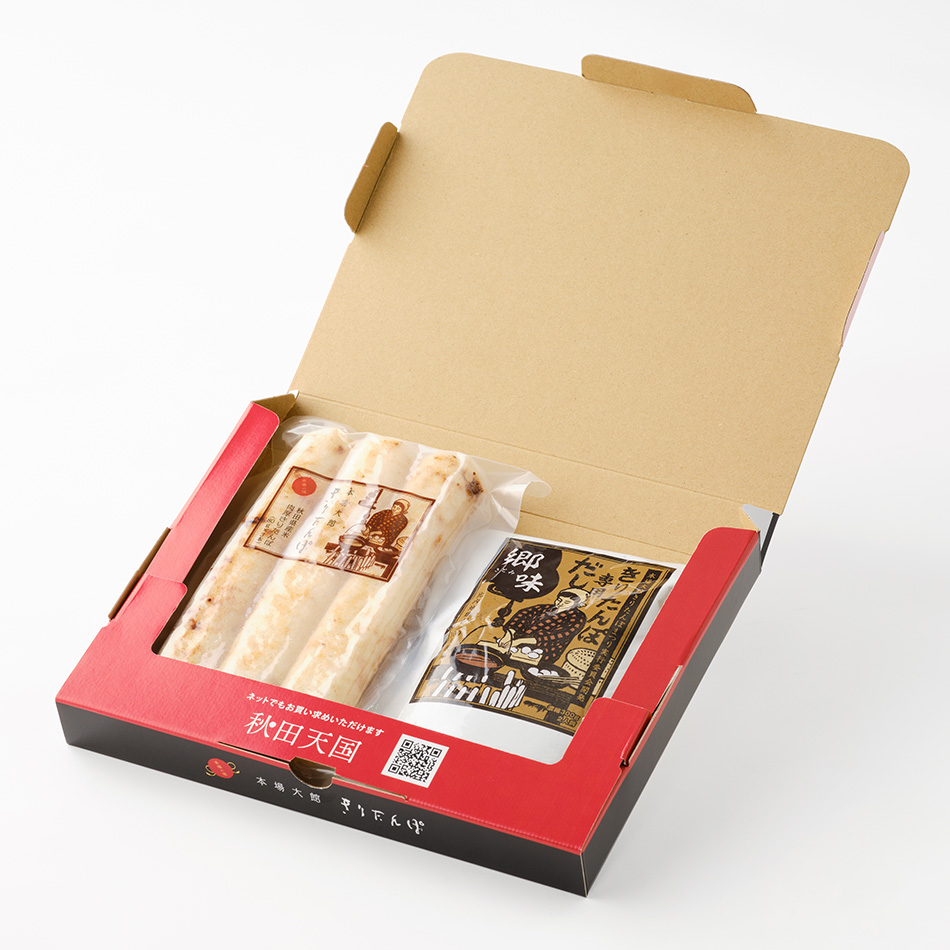 比内地鶏のがら100%の濃縮だし「郷味(さとみ)」と、秋田県産米を使った香ばしいきりたんぽのセットです。