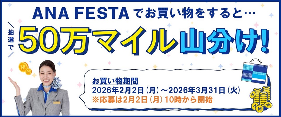 キャンペーン期間中、ANA FESTAで2,000円(税込)以上ご購入&ご応募いただいたお客様のうち、1,000名様で50万マイルを山分け!