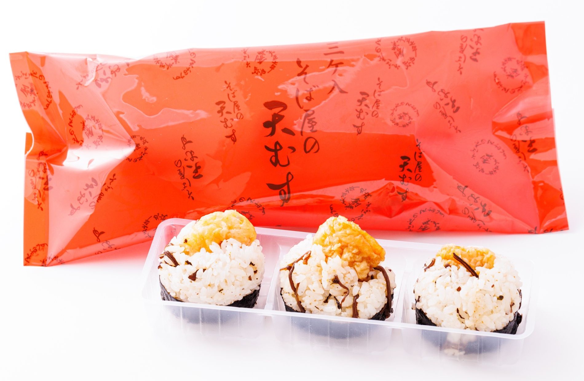 <丸政>のそば屋で販売していた人気メニューの天むすを商品化。海老天を木耳ごはんで包んだ一口サイズの天むすが3個入っています。ぷりぷり食感の海老天と木耳ごはんが相性抜群です。