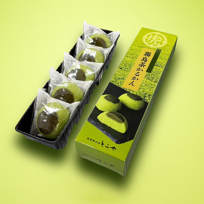 有機霧島茶入りの餡をのせ、しっとりと蒸しあげた「かるかん」で、上品な甘さとお茶の深みが調和する逸品に仕上げております。