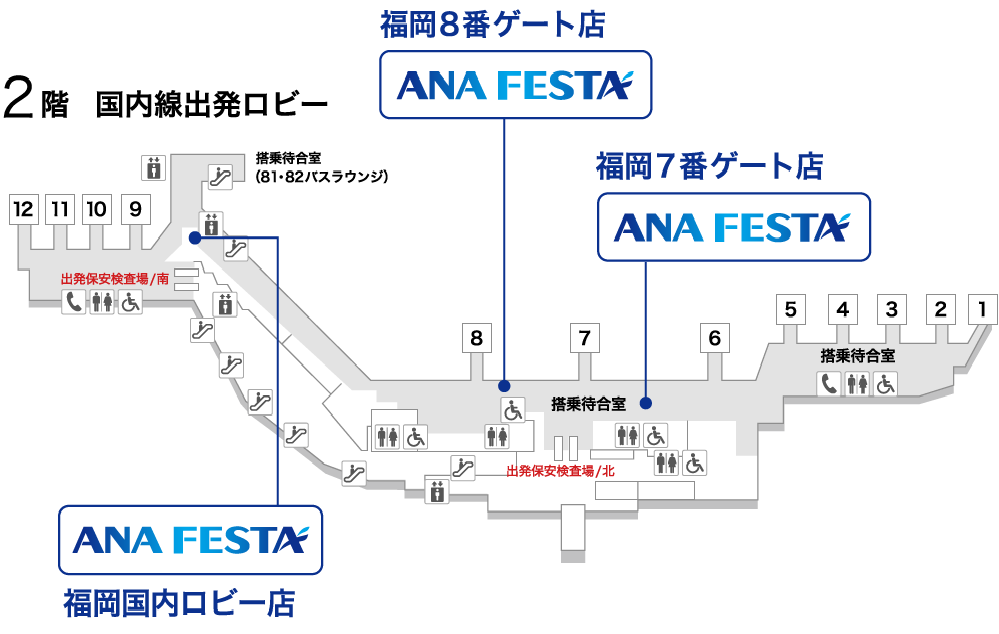 なお、手荷物検査場 通過後にございます、ANA FESTA福岡7番ゲート店・ANA FESTA福岡8番ゲート店は通常通り営業しております。