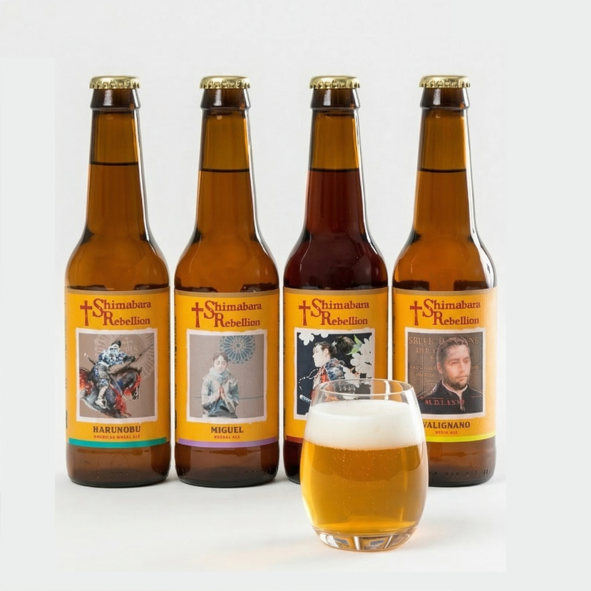島原半島のキリシタン化に最も貢献した神父ヴァリニャーノの故郷であり、南島原市の姉妹都市であるイタリアのキエーティの醸造所と共同開発したクラフトビール。半島のキリシタン時代を代表する人物4 人の名を製品名とし、長崎県の画家・柏本龍太氏による美しいラベルデザインが、その歴史と芸術性を雄弁に物語ります。